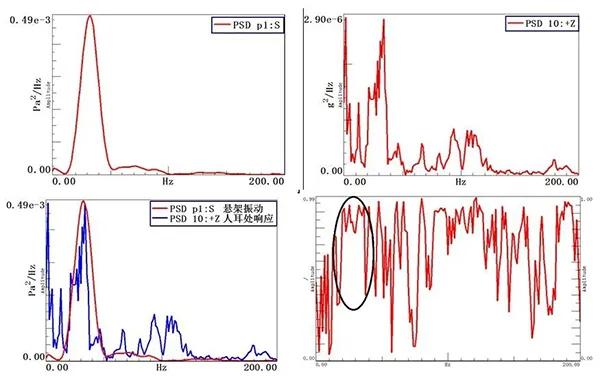 如上圖所示,對靜止狀態的樣品車的車輪進行激勵,同時采集懸架處的振動 (X) 與車內駕駛員右耳處的聲音 (Y),將這兩者進行相干性計算,驗證其因果關系。如下左圖為懸架上的振動信號頻譜,激振器激勵出的能量主要集中在10~50Hz,下右圖為駕駛員右耳處的聲壓頻譜,在對應頻率處產生了較大的激勵。
