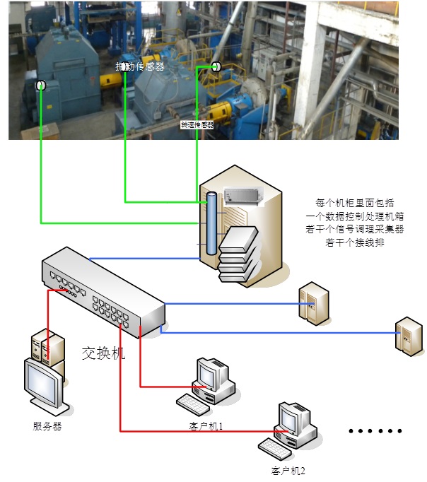 “大型生產(chǎn)線在線監(jiān)測及故障分析系統(tǒng)”利用傳感器檢測、信號處理、計算機(jī)技術(shù)、數(shù)據(jù)通訊技術(shù)和旋轉(zhuǎn)機(jī)械的故障診斷相關(guān)技術(shù),由振動加速度傳感器、智能信號調(diào)理采集器、嵌入式信號采集與服務(wù)平臺等硬件,以及信號采集程序、網(wǎng)絡(luò)服務(wù)器程序和振動監(jiān)測與故障分析客戶端程序等軟件兩部分組成。這主要考慮到咱們設(shè)備的重要性、分散性和測點數(shù)量的規(guī)模性。