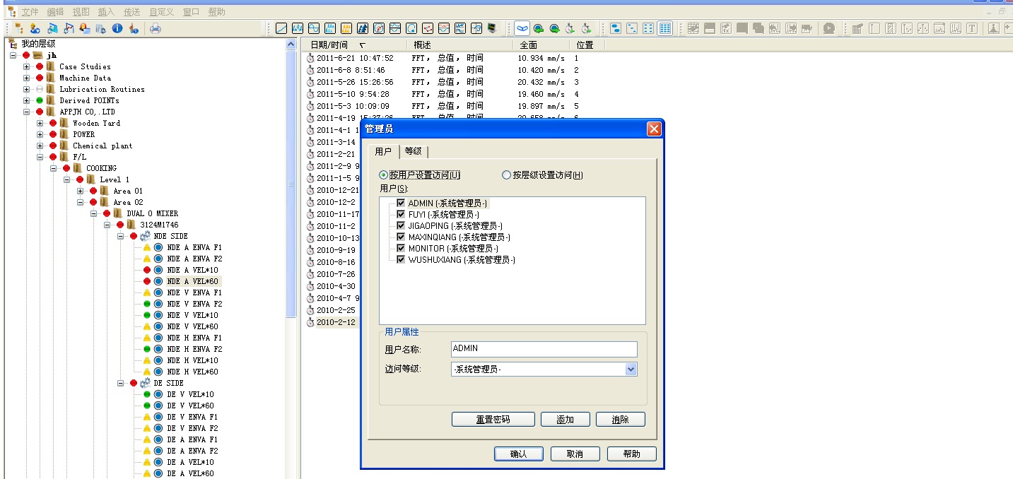 本系統(tǒng)采取C/S模式,在服務(wù)器端運行數(shù)據(jù)庫SQL Server,嵌入式采集平臺上運行采集程序,在局域網(wǎng)上任意一臺計算機(jī)上安裝客戶端程序,登錄用戶名和密碼可以訪問任意子系統(tǒng)。 系統(tǒng)采集軟件可以任意設(shè)置所有振動測點名、測點參數(shù)、采樣時間、采樣頻率、采樣長度、傳感器類型、傳感器靈敏度、控制開閉、地址設(shè)置等。具有當(dāng)今國際經(jīng)典監(jiān)測與診斷軟件的風(fēng)格和功能。