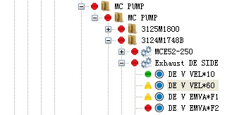 具體設(shè)備以樹狀列表形式顯示,樹狀列表由用戶根據(jù)設(shè)備情況確定層次數(shù),每個節(jié)點用兩個圖標(biāo)分別顯示報警狀態(tài)和設(shè)備屬性(用不同的圖標(biāo)表示設(shè)備組、軸承、齒輪、溫度、轉(zhuǎn)速等),設(shè)備組或具體設(shè)備屬性以多頁窗口形式輸入數(shù)據(jù)庫,需輸入漢字的編輯框自動打開該操作員指定的漢字輸入法。點擊某設(shè)備圖標(biāo),右邊出該點采集數(shù)據(jù)包、設(shè)備圖像。 樹狀列表參考下圖: