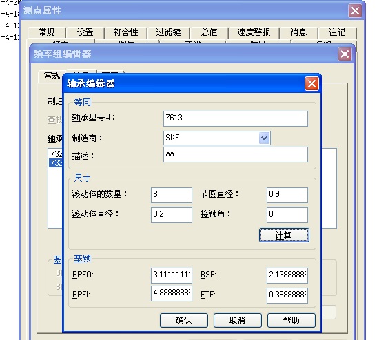 機(jī)器節(jié)點屬性的“頻率”屬性是由用戶選擇特征頻率組,如:軸承型號,若系統(tǒng)沒有該軸承,由用戶添加。如下圖: