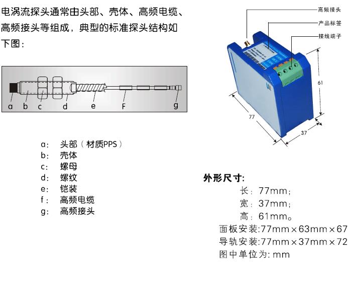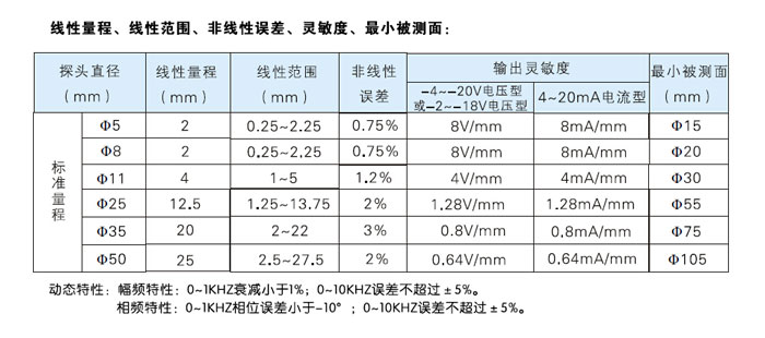 | 1 | 使用環境 | -20℃~70℃ | 2 | 靈敏度 | -8v/mm | 3 | 頻響 | 0~10KHZ | 4 | 量程 | 2mm | 5 | 供電電源 | -20~-26VDC | 6 | 電氣連接 | 高頻接頭連接 | 7 | 電纜總長 | 5m | 8 | 安裝方式 | 導軌安裝 | 9 | 前置器輸出 | -2~-18V |