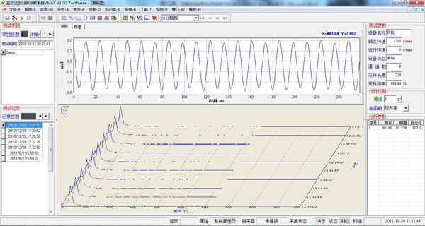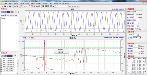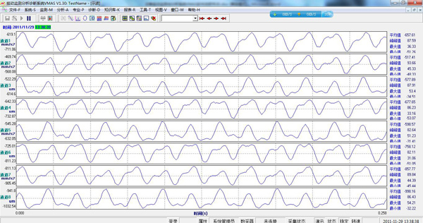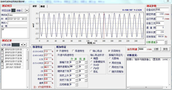 旋轉機械故障診斷: 內置經典旋轉機械故障樣本,通過采集到的波形信息,告訴軟件轉速和附加特征(升速特性 、降速特性、 軸心軌跡、負荷特性)便可得到診斷意見。可以自學習的真正神經網絡診斷,可以生成word報告。